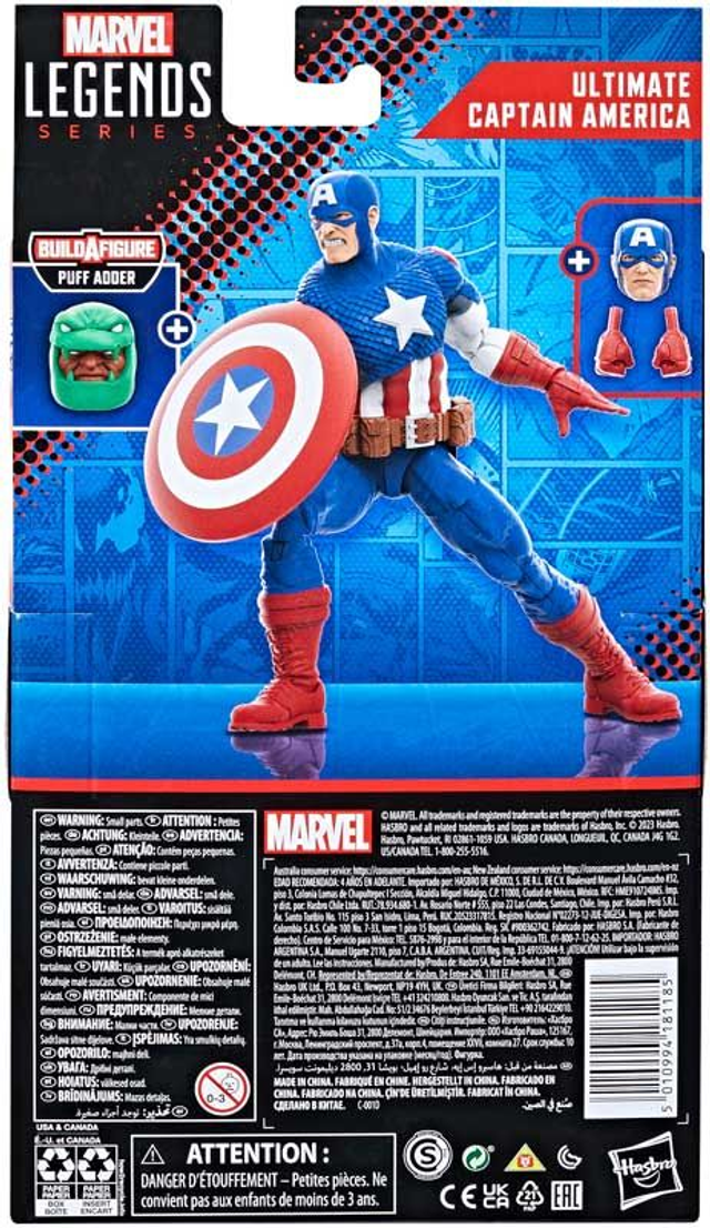 The Captain America of the Ultimate Universe has served as the Allies’ super-soldier in World War II, the leader of the first Ultimates team Bring the excitement and wonder of the Marvel Universe to your collection with action figures from the Hasbro Marvel Legends Series! (Additional products each sold separately. Subject to availability.) This collectible 15-cm-scale Marvel Legends Classic Comic figure is detailed to look like the Ultimate Captain America character from Ultimates (that letter on his head doesn’t stand for France) featuring premium detail and multiple points of articulation. It comes with three accessories, including alternative hands and his iconic shield; plus a Build-A-Figure piece Copyright 2022 MARVEL. Hasbro and all related terms are trademarks of Hasbro.